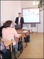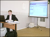 | Представитель компании «Кирилл и Мефодий» Н. Стромов на презентационном семинаре | |