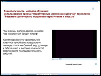 Участникам тренинга, например, было предложено восстановить последовательность событий, которые привели к удлинению шеи у жирафа. После этого настало время проверить, правильно ли мы выстроили последовательность событий. Для этого участники тренинга обратились к мультимедиалекции из Базы знаний «КМ-Школы» «Теория эволюции Ламарка». Теперь можно обсудить, какие вопросы остались неразрешенными, какие предположения подтвердились. Таким образом, интерактивная доска помогла нам технологично организовать этап актуализации знаний, а мультимедиалекция на основе видеофрагмента, демонстрирующего поведение жирафа в естественных условиях, помогла понять и усвоить основные положения теории эволюции.