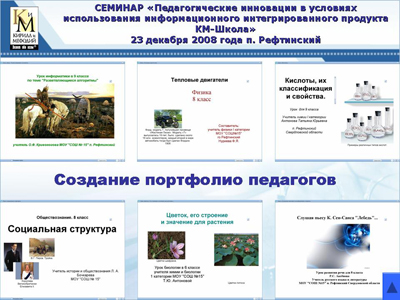 Аксенова Роза Сафовна «В этом году в школе проходили курсы по обучению работе в КМ-школе. Возможности КМ-школы поразили, я думаю, не только меня. Появилась возможность по-новому построить урок, учитывая особенности нынешних детей (если раньше разъяснения на вербальном уровне были достаточны, то теперь у наших детей преобладает визуальное восприятие, и это приходится учитывать при подготовке урока)»