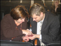 | Процесс выполнения одного из заданий для участников семинара — поиск кофейных зерен в чашке с фасолью | 11 октября 2006 года в конференц-зале компании «Кирилл и Мефодий» прошел очередной тематический семинар на тему «Возможности использования ИИП „КМ-Школа“ в работе классного руководителя».