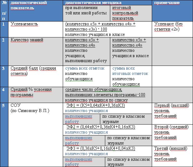 В практике работы школы активно используются следующие методики диагностики результативности работы учителя и образовательного учреждения, основанные на количественно-качественных показателях, выраженных в школьных отметках (баллах):