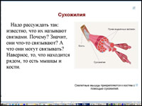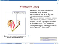 Затем следует анализ ее условия и вопроса, т.е. выясняется, что в условии задачи нам известно, а что нет. Путем опыта, наблюдения за «поведением» мышцы согнутой и разогнутой руки дети убеждаются, что в покое (рука свободно разогнута) мышцы длиннее и тоньше, в движении (рука согнута) — мышцы короче и толще. Результаты наблюдения — то известное, что включается в условие задачи. На этом этапе использование анимированной иллюстрации (без дикторского текста) позволяет еще раз наблюдать этот процесс, скрытый от нашего взора. Анимированная иллюстрация позволяет изучать трудно наблюдаемые процессы, восхититься сложностью и простотой строения человека, увидеть в таком привычном движении, как сгибание и разгибание руки, удивительную загадку. В данном случае наблюдение за собственным телом и наблюдение за цифровым изображением взаимодополняют и взаимообогащают друг друга.