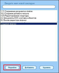 Учитель может воспользоваться этой функцией тренинга для организации списка закладок на «узловые точки» в материале курса. По закладкам можно будет, помимо тестирования, выборочно проверить полученные учеником навыки работы с текстовым документом.