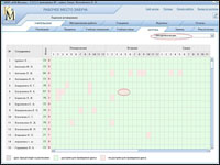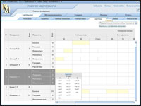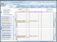 Процесс составления расписания рекомендуется разделить на этапы: по классам или по группам классов. Рассмотрим это на примере составления расписания для 1 «А» класса. Щелкнем мышью по надписи в заголовке столбца: 1 «А». Видим, что возможность заполнения расписания для всех классов, кроме выбранного (его ячейки остаются белыми), блокируется. Слева расположены ярлыки с фамилиями только тех учителей, у которых определена нагрузка в данном классе, а остальные ярлыки не видны.