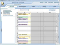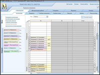 Этап 4. Непосредственное составление школьного расписания уроковМы проделали необходимую подготовительную работу и теперь можем перейти непосредственно к составлению расписания. Для этого в разделе «Учительская» щелкнем по закладке «Расписание». В правой части рабочего стола завуча видим пустую форму - таблицу будущего расписания уроков, а в левой части стола - столбец из разноцветных именованных ярлыков. Количество ярлыков определяется учебной нагрузкой преподавателей. Полуавтоматический режим, имитирующий традиционный подход к составлению расписания. Заполнять таблицу расписания можно в двух видах: «Классы» или «Сотрудники». Выберем вид «Классы», при котором в заголовках столбцов таблицы отображаются классы, а на каждом цветном ярлыке в левой части отображается фамилия учителя, учебный предмет и его учебные часы. Цифра справа от ярлыка обозначает количество часов учебной нагрузки у данного учителя по данному предмету.